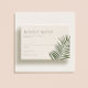 This wedding invitation features a minimalistic and elegant design. The layout is simple, with soft, neutral tones, and the text is delicately arranged. Surrounding the text are illustrations of palm leaves, adding a tropical or botanical touch without overpowering the design. These green leaves are positioned in the top left and bottom right corners, framing the invitation in a way that gives a fresh, airy feel. The overall style is contemporary and clean, perfect for a nature-inspired or destination wedding.