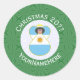 Round sticker for Christmas decor featuring an angel dressed in the flag of Argentina. The angel is found inside a white, fractal circle of squiggly squares with a background of green squiggly squares. Add your own text, if you wish. Personalize with a name and customize with the year. Fun stocking stuffer. Great for decorating gifts. Honor your Argentine heritage during the holiday season.