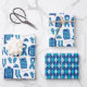 A wrapping paper sheet set built with the traditional argyle pattern in blue. Two sheets with argyle clothes illustrations and one with the argyle pattern.