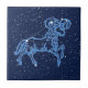 Tile in the zodiac symbol for Aries in soft silver blue, overlaid with the stars of the constellation, against a starry sky background in deep midnight blue