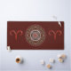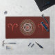 This mandala was designed for the zodiac sign, Aries, depicting a red jasper stone in the center surrounded by elements representing the sign, such as the symbol for the sign, the constellation, and the alchemical symbol for Fire, as well as filigree vines and weaves wrapping it all into a solid image in shades of red, silver, and brown.