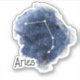 This contour-cut sticker features an artistic representation of the Aries constellation set against a watercolor backdrop that mimics a starry night sky. The design incorporates shades of deep blue and white, suggesting the vastness and mystery of space. The constellation itself is depicted by simple white lines connecting stars, which are represented by brighter white dots. Below the constellation, the word “Aries” is written in a clear, bold typeface, grounding the design with a touch of modernity.