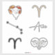 Aries the Ram astrology zodiac drawings and symbols in a custom cut vinyl sticker page with six different images. Delicate color and line ink drawings, symbols in black and gold, a black constellation of stars, and Aries text in a dark modern font.