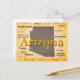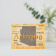 Aged antique paper Arizona state pride image including map silhouette with cities, towns and nickname.