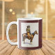 This is a wonderful image of "Arizona Cowboy" by famed western illustrator and painter Frederic Remington, and depicts a desert cowboy in his chaps on a bay horse. The image is placed on a dark brown background framed in gold. Both sides of the mug have the same image, with the text in gold in the middle of the mug, "Arizona Cowboy by Frederic Remington".