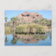 A distinctive mountain in Papago Park, Phoenix, Arizona is reflected in a small lake. The bright blue sky and palm trees frame the brown mountain both in the upper part of the postcard and in the reflection. The words, "greetings from Arizona" can be easily customized or deleted to your desire.