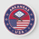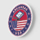 Badge of Arkansas with flag of Arkansas and flag of USA colors, rounded shape.