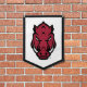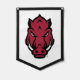 The Arkansas Razorbacks mascot logo is a fierce representation of the school's iconic hog mascot, staring directly forward with an intense, determined expression. The wild boar's face is depicted in bold crimson and black outlines, with sharp angles emphasizing strength and aggression. The eyes are narrowed, adding to the intimidating look, while the strong, symmetrical lines across the face reinforce its toughness. This logo embodies the competitive spirit and power of the University of Arkansas athletics.