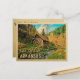 Vintage Arkansas Save The Date postcard in fun retro Ozarks mid-century style. It features a rustic woody nature landscape with a wood cabin and water wheel mill, and a pretty creek stream with fall leaves for an autumn or end of summer feel. This Arkansas Save The Date postcard will be perfect for a country wedding or nature and camping wedding.