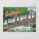 This beautiful retro-style design celebrates the natural beauty of the Natural State. It features the classic "Greetings from ARKANSAS" typography set against a scene dominated by a rushing waterfall and lush green forests. An inset picture highlights a historic neoclassical building, blending natural scenery with the state's heritage. Perfect for fans of vintage travel posters, retro artwork, nature, hiking, and the state's picturesque rivers and woods.