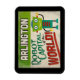 A charming Arlington Texas vintage travel refrigerator magnet featuring a funny and friendly robot, along with fun retro style text that says, "See you in Arlington"