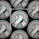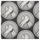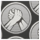 Silver round medal with two hands in arm wrestling. Custom background color.