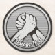 Silver round medal with two hands in arm wrestling. Custom background color. Custom text.