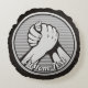 Silver round medal with two hands in arm wrestling. Custom background color. Custom text on both sides.