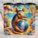 This is a whimsical and charming illustration of an armadillo enjoying a day at the beach. The armadillo is holding a blue and white beach ball and is surrounded by a variety of seashells, starfish, and other beach-themed items. In the background, there is a serene blue ocean with dolphins jumping and sailboats floating under a bright, sunny sky. The overall aesthetic is cheerful, playful, and perfect for summer.