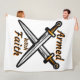 This fleece blanket displays the words “Armed With Faith” in a unique print front with black letters orange outline featuring a set of swords crossed over each other in the center with this faith based quote theme. This Blanket is made from 100% buttery soft and cozy polyester fleece with edge-to-edge vibrant full color sublimation printing and double edge stiching with a off-white colored back machine washable.