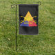 Flag bracket is super easy to assemble. There is a prong fork that goes into the ground. I dug a shallow hole to bury the prongs and still had enough height. Reinforced stitching on for the flag opening. Colors are true to the website. Mona Lisa's sign with the text is easy to read, the text is clear and not blurry.
