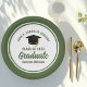 This white and army green custom graduation party paper plate features classy typography of your military academy, high school, or college name for the class of 2025. Customize with your graduating year under the chic white handwritten script and black grad cap for great personalized graduate decor.