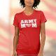 This t-shirt features the text "ARMY MOM" with a heart shaped flag instead of the "O" in the "MOM" text. This tee helps show your pride and support for our military men and women who are serving on behalf of the Army. The design is shown here in white on a red tailored tee shirt but you can opt for a sweatshirt, a long-sleeve tee, and other designs and colors. If you choose a white tee, then change the border color of the design to a darker color.
