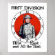 This vintage World War I poster features a soldier, holding a bayonet fitted rifle, standing in the center of a clock. It reads, "First - Last - And All The Time." Celebrate WWI and Army History with this digitally restored vintage war poster from The War Is Hell Store.