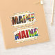 Graphic cutout stickers of images of hot-air balloons at the Presque Isle, Maine Balloon-fest in Aroostook County. Text is in a gold color with the word MAINE outlined in gold and an image of the balloons inside the text. Can be purchased as a solid white sticker or a transparent in sizes from 3x3 inches up to 14x14 inches. Each sheet has two different styles on them.