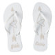 White bride's flip flops with graphics of a champagne glitter looking heart outline, with an arrow going through it. Custom tan text is fully customizable to suit your needs.