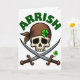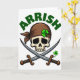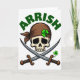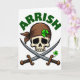This design shows a bone-white skull centered on a plain white background, wearing a neatly tied brown bandana that feels like a friendly wink rather than a threat. A bright green shamrock sits on the bandana, adding a lucky touch that softens the pirate edge 💚. Above the skull, the word “ARRRISH” curves in emerald green letters, placed like a header that frames the face. Below, two cutlasses cross in even symmetry, their silver blades angled outward with copper-toned hilts near the bottom. A second green shamrock floats close to the lower hilt, like a small token passed between close friends ☘️. Strong black outlines define every shape, giving the image a crisp, emblem-like look without clutter. The final detail is the way the crossed swords form an X beneath the skull, with the green accents standing out sharply against the white space.