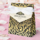 Art Deco abstract tower building black, gold favor box featuring a black and gold tower building, black and golden floral damask pattern and beige/ecru solid color with gold stripe. This elegant design is a modern approach to a vintage/retro style that resembles that of the Roaring 20’s and The Great Gatsby. It is part of a wedding set and is completely customizable.