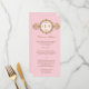 A menu card that takes its influence from the Art Deco era. An ornate golden band, looking like a Victorian wristwatch, features a medallion holding the couple's monogram. The pale pink background prints a subtle pattern as a watermark. Add or reduce space between the first and last initials to balance with the central monogram. Add a customized menu underneath. A classic look to set the mood for any wedding. Available in alternate colors with matching products.