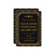 These save the dates feature a black and gold color palette, a geometric frame, geometric patterns, and other stylistic details all inspired by Art Deco and the roaring twenties. You can customize the sample text fields to your liking.