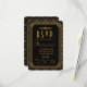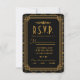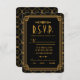 These RSVP response cards feature a black and gold color palette, a geometric frame, geometric patterns, and other stylistic details all inspired by Art Deco and the roaring twenties. You can customize the sample text fields to your liking.