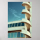 A blue sky behind an art deco building with a spiral stiarcase and lots of windows.