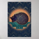 A proud black cat silhouette triumphs with a stylized golden fish trophy atop a teal pedestal. The clean deco architectural surround and orange highlight details create a celebratory 1920s mood for kitchens, dining areas and cat lover spaces.