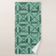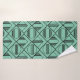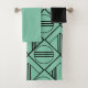 This towel set has a bath towel with an art deco design of diamonds inside diamonds with vertical lines and circles with horizontal lines on a field of turquoise, a black washcloth, and a turquoise hand towel.