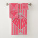 This towel set has an art deco design of diamonds and lines in silver on a field of pink.