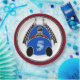 What Fun! Sure to delight both children & car racing fans, the design adorning this paper plate is an original digital painting by Leslie Sigal Javorek of a head-on view of a bright blue 1920’s Bugatti-inspired car and driver with checkered flags & tire marks trailing behind.