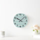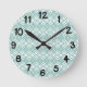 This wall clock has an art deco design of overlapping diamonds in verditer (green) and blue on a field of white.