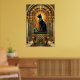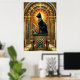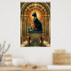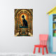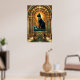 A regal black cat sits enthroned on a stepped pyramid pedestal beneath a golden sun disc and teal jewelry motifs. This majestic 1920s Egyptian‑inspired art deco design brings exotic luxury to any modern interior or cat lover's collection.