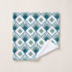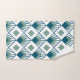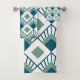 This towel set has an art deco design of teal diamonds with diagonal lines and seafoam green diamonds on a field of white.