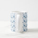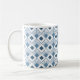 This mug has an art deco design of dusty blue diamonds with diagonal lines and dark blue diamonds on a field of white.