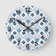 This wall clock has an art deco design of dusty blue diamonds with diagonal lines and dark blue diamonds on a field of white.