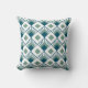 This throw pillow has an art deco design of teal diamonds with diagonal lines and seafoam green diamonds on a field of white.