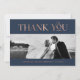 This elegant wedding thank you card features a faux rose gold look on navy blue, with glam text and art deco elements. Add your own personal photo.
