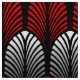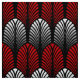 Fabric in a vintage Art Deco wallpaper pattern based on a stylized feather - shades of silver gray / grey and deep Chinese red on a black background