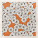 An Art Deco pattern glass coaster based on a traditional, stylized chrysanthemum pattern used in Japanese textiles, in creamy white outlined in black with a rust orange background