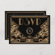 A bold and elegant, vintage style wedding RSVP response card with a roaring twenties "Great Gatsby" theme in black and gold tones. A black background highlights the intricate geometric, Art Deco style border in golden beige tones. Decorative, period style fonts have been selected to complete the look.