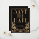 A bold and elegant, vintage style wedding Save the Date announcement with a roaring twenties "Great Gatsby" theme in black and gold tones. A black background highlights the intricate geometric, Art Deco style border in golden beige tones. Decorative, period style fonts have been selected for your event wording.