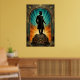 A classic portrait of Jazz Age sophistication and mystery. This striking artwork features a black silhouette of a gentleman in a top hat and formal coat, holding a cane while standing confidently upon a tiered Art Deco pedestal. Framed by a radiant golden sunburst that transitions into a deep teal archway, this piece captures the timeless glamour of a 1920s evening. Perfect for a modern office, home bar, or as a statement piece in a minimalist interior.