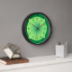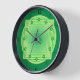 Clock in overlapping geometric patterns, consisting on gradient stripes, ranging from medium to pastel lime green, on an emerald green background, with 3-d look diamond shaped accents at the hours.