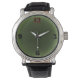 Oversized men's watch featuring an original, unique Art Deco face, suggesting a glowing jade green light. The "12" is in coral red, while the other numerals are in a shiny-appearing black.
